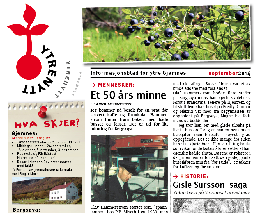 I dag trykkes ny YtreNytt-utgave. Mange spennende artikler og kunngjøringer. Utlevering på Gjemnesstranda og Bergsøya er sikret. Vi må finne en person på Storlandet som kan kjøre ut til postkassene. Send melding til Madlen på 97177219 eller post@gjemnes-ytre.no om du vil hjelpe :-) Tusen takk!