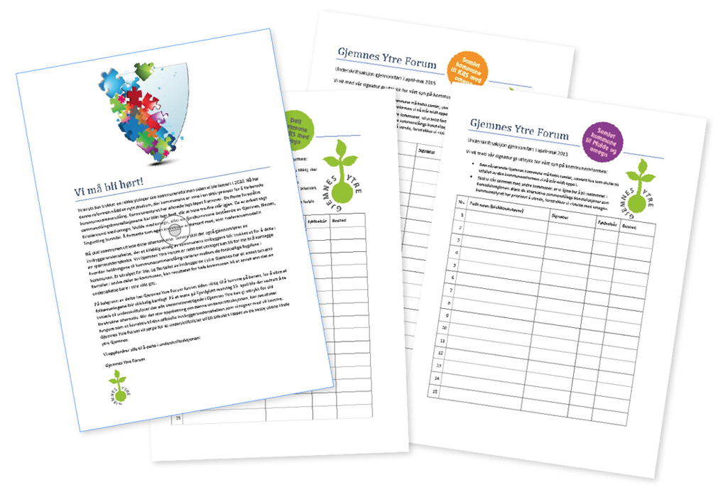 På bakgrunn av dette har Gjemnes Ytre Forum funnet tiden riktig til å komme på banen, for å sikre at folkemeningene blir skikkelig kartlagt. På et møte på Fjordgløtt mandag 13. april ble det vedtatt å ta initiativ til underskriftslister der alle stemmeberettigede i Gjemnes Ytre kan gi uttrykk for sitt foretrukne alternativ. Blir det stor oppslutning om denne underskriftsaksjonen, kan resultatet fungere som et korrektiv til den offisielle innbyggerundersøkelsen som vi regner med vil komme. Gjemnes Ytre Forum vil sørge for at underskriftslister vil bli sirkulert i løpet av de neste ukene i hele ytre Gjemnes.